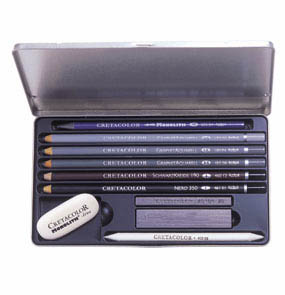 This set features a range of graphite drawing materials as well as a charcoal pencil and a Nero pencil for deep black lines. The inclusion of four water-soluble graphite pencils makes this set perfect for experimental techniques and traditional sketching. Also includes 2 larger graphite sticks, a black chalk and a monolith eraser.